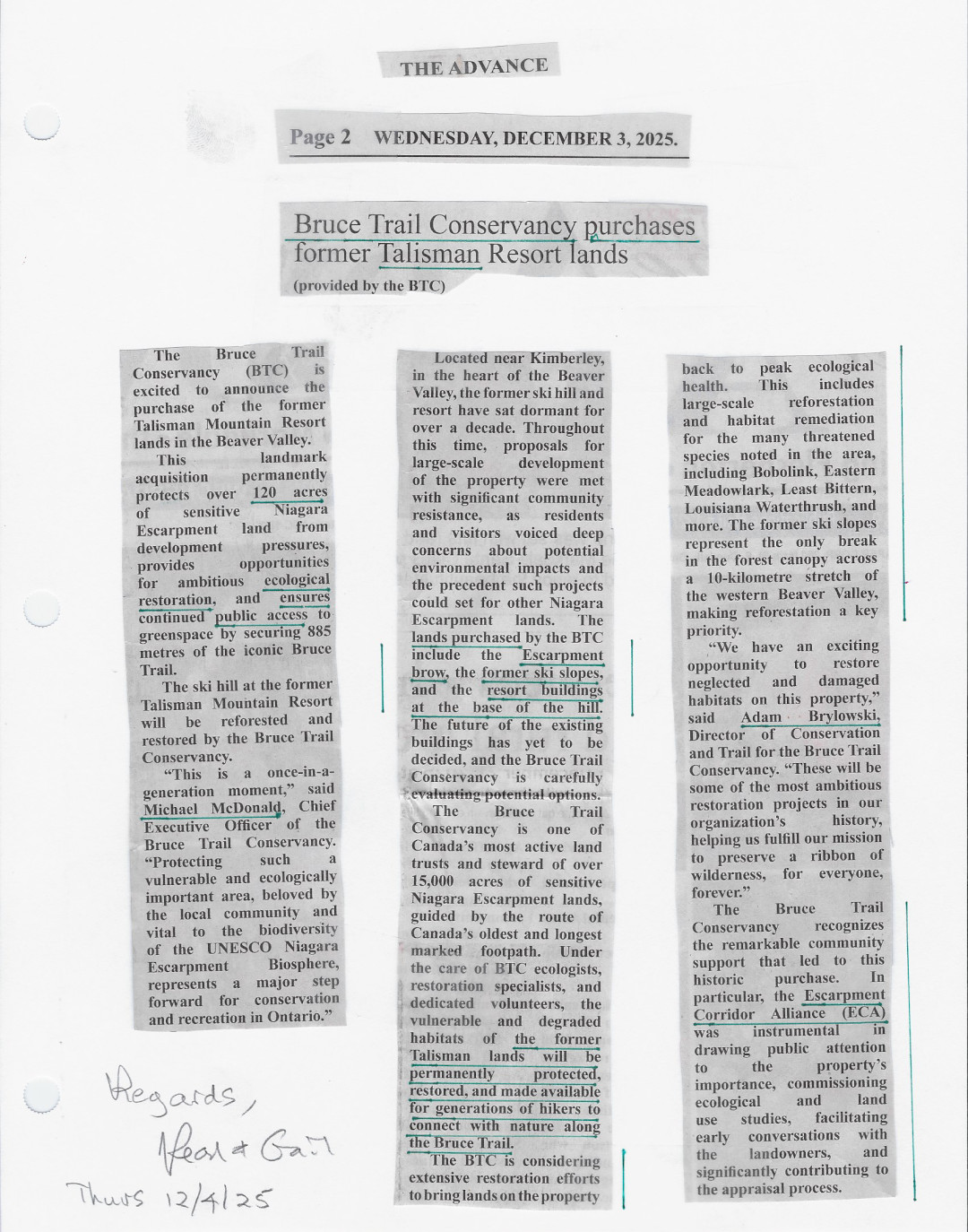 - December 3, 2025 - Bruce Trail Purchase of the Centrepiece of the Talisman Lands is Key to the Beaver Valley’s Natural Corridor and Watershed